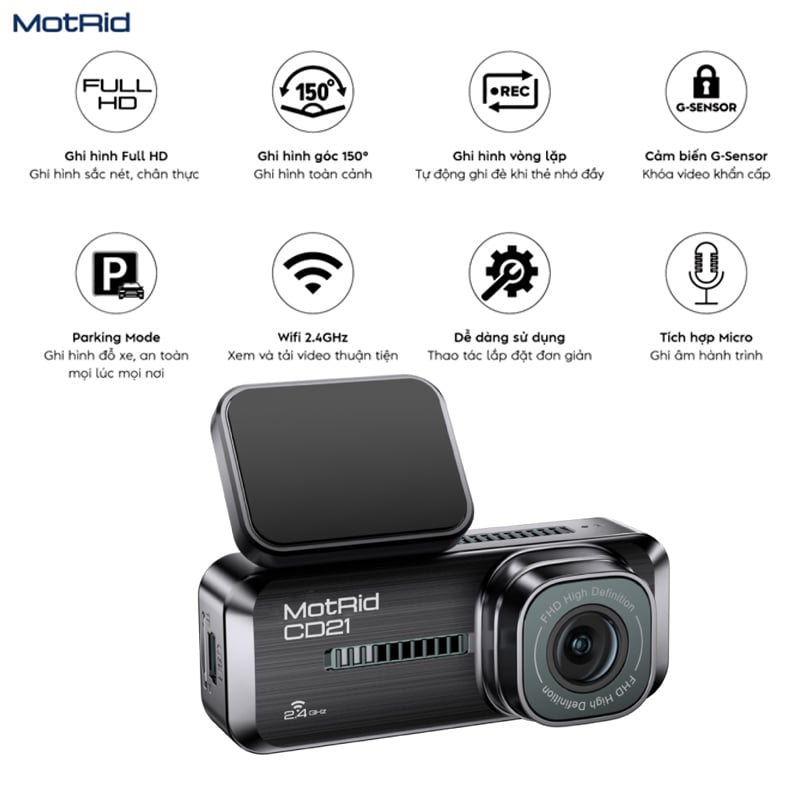 Camera hành trình MotRid CD21 với độ phân giải Full HD 1920 x 1080, góc quay rộng 150°, tích hợp WiFi, cảm biến va chạm G-Sensor, ghi hình vòng lặp và micro thu âm, đã mang đến giải pháp ghi hình hiệu quả cho người dùng phổ thông lẫn tài xế thường xuyên di chuyển trong đô thị hoặc trên các cung đường dài.