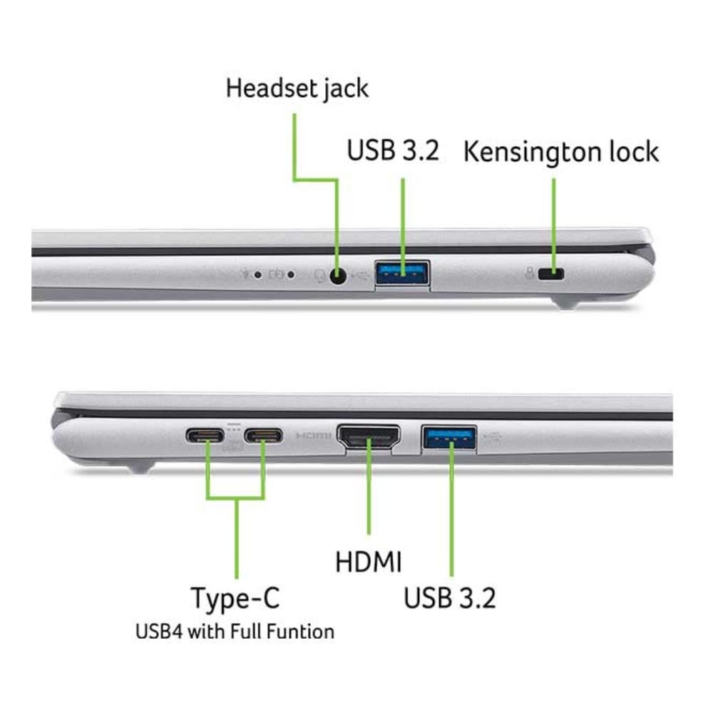 Acer Aspire Go AG15-72P được trang bị đầy đủ các cổng kết nối cần thiết cho người dùng hiện đại, bao gồm USB Type-C hỗ trợ DisplayPort, HDMI 2.1, USB 3.2 Gen 1, jack tai nghe 3.5mm cùng kết nối không dây Wi-Fi 6E và Bluetooth 5.1. Hệ thống cổng kết nối này cho phép người dùng dễ dàng kết nối với màn hình ngoài, máy chiếu, thiết bị lưu trữ và các phụ kiện ngoại vi khác mà không cần hub chuyển đổi phức tạp.