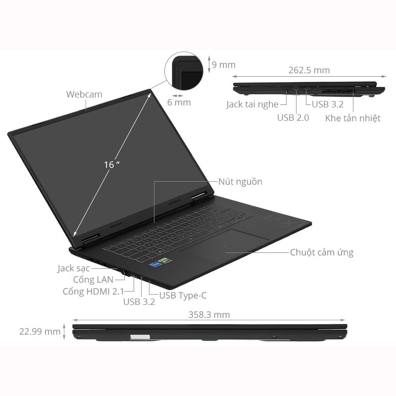 Laptop được trang bị nhiều cổng kết nối phục vụ cho nhu cầu làm việc và giải trí. Các cổng HDMI, USB-A, USB-C, LAN và jack tai nghe giúp người dùng dễ dàng kết nối với nhiều thiết bị ngoại vi. Wi-Fi 6E và Bluetooth 5.2 cũng giúp hệ thống duy trì kết nối mạng ổn định với tốc độ cao.