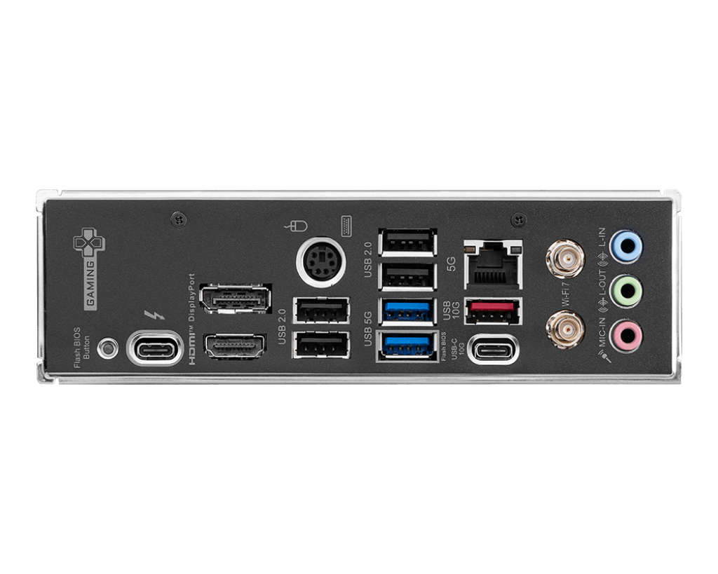 | Cổng kết nối phía sau | 1x Thunderbolt 4 (DisplayPort) 1x USB-C 3.2 Gen 2 1x USB-A 3.2 Gen 2 2x USB-A 3.2 Gen 1 4x USB-A 2.0 1x Mouse / Keyboard PS/2 1x HDMI 2.1 1x DisplayPort 1.4 1x BIOS Flashback Button 1x LAN 5Gb 1x Wi-Fi/Bluetooth 3x Audio Jack |
