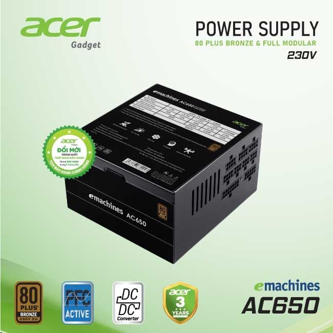 | Thông tin chung - Tên sản phẩm | NGUỒN ACER AC650 80PLUSBRONZE (180V-230V) FULL-MODULE - BH 36T |