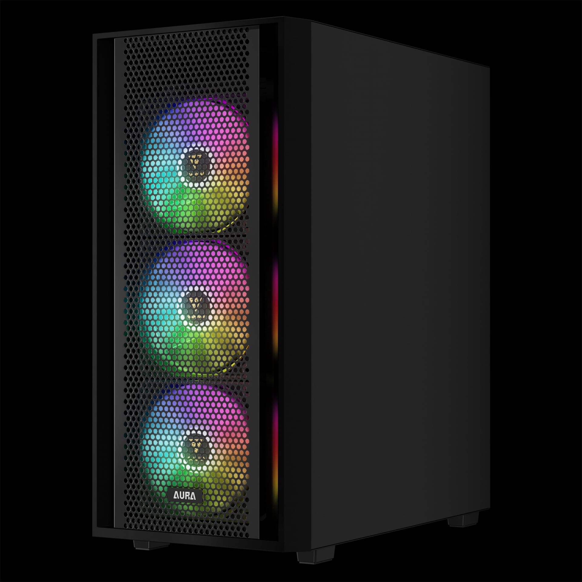 Thùng máy Gamdias Aura GC2 Elite ARGB F-ATX (Kèm Sẵn 4F ARGB) - Đen gây ấn tượng với mặt trước đục lỗ dạng lưới kim loại, giúp tăng cường khả năng hút gió vào bên trong hệ thống. Thiết kế này không chỉ mang lại hiệu suất làm mát tối ưu mà còn tạo nên diện mạo mạnh mẽ, đậm chất gaming cho dàn PC của bạn.