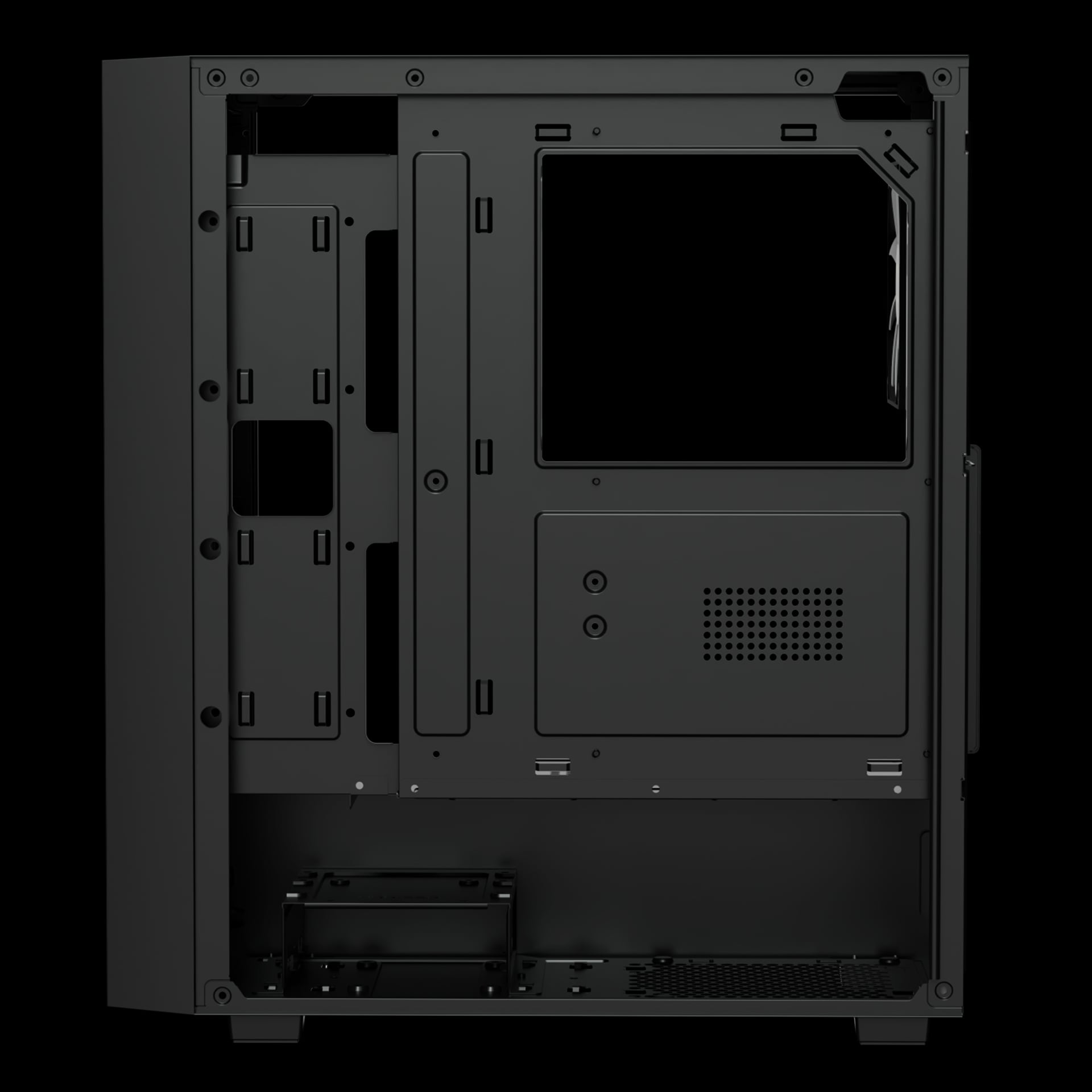 Case được trang bị bộ lọc bụi từ tính giúp ngăn bụi bẩn xâm nhập, đồng thời dễ dàng tháo rời để vệ sinh định kỳ. Bên trong là vỏ bọc PSU (PSU shroud) giúp che giấu dây nguồn và ổ cứng, tạo không gian gọn gàng và cải thiện luồng gió.