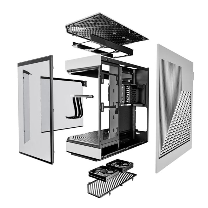 Tông trắng giúp tổng thể case sáng và thoáng hơn khi đặt trên bàn, trong khi các chi tiết đen tạo điểm nhấn đủ mạnh để hệ thống không bị nhạt hoặc thiếu chiều sâu. Đây là kiểu phối màu đặc biệt phù hợp với những ai thích build PC theo phong cách tối giản, clean setup, gaming hiện đại hoặc workstation sáng tạo có tính thẩm mỹ cao.