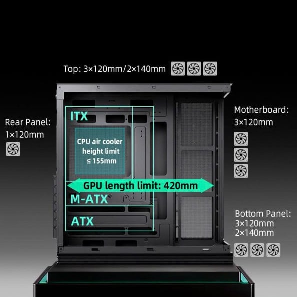 Thùng máy hỗ trợ lắp radiator lên đến 360mm ở phía trên và bên hông, cùng nhiều vị trí lắp quạt như trên, dưới và phía sau, giúp tối ưu luồng gió và tăng hiệu quả làm mát cho toàn bộ hệ thống. Người dùng có thể tùy chỉnh hệ thống tản nhiệt theo nhu cầu sử dụng.