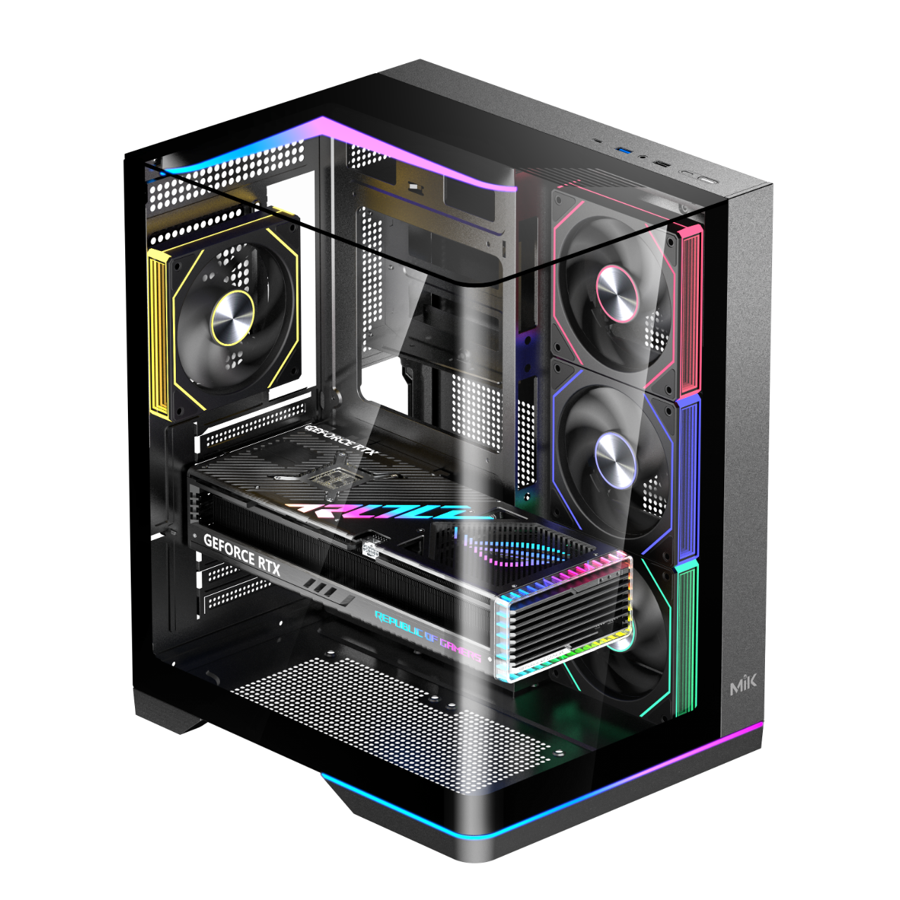 MIK G8 Nova X được thiết kế với 3 mặt kính cường lực cao cấp, gồm hai cạnh hông và mặt trên nóc, mang đến vẻ ngoài tinh tế, hiện đại. Kiểu dáng cong liền khối giúp không gian hiển thị nội thất bên trong trở nên rộng mở, cho phép người dùng dễ dàng khoe trọn bộ linh kiện cao cấp như mainboard, card đồ họa, RAM hay hệ thống LED RGB.