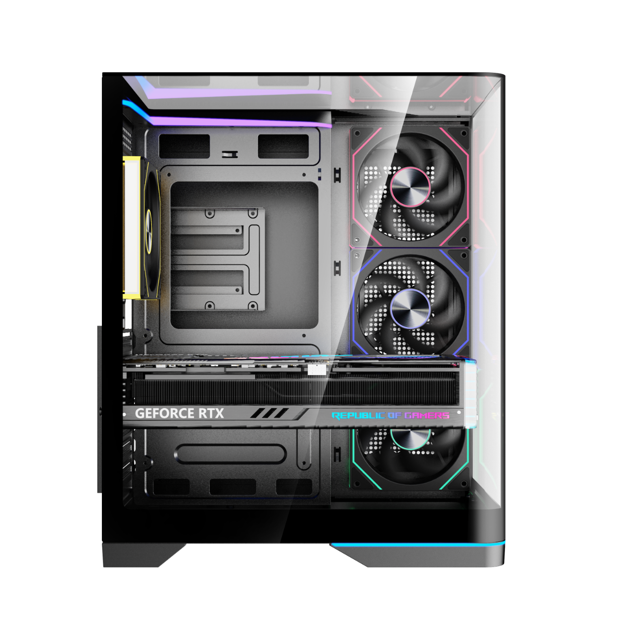 Chất liệu thép SPCC kết hợp kính cường lực không chỉ mang lại độ bền cao mà còn giúp bảo vệ linh kiện khỏi bụi bẩn và va đập nhẹ. Màu đen chủ đạo cùng dải LED ARGB chạy dọc phần trên và dưới mặt kính tạo nên điểm nhấn nổi bật, mang lại hiệu ứng ánh sáng bắt mắt cho góc máy tính của bạn.